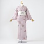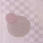 落ちついたピンク地に水玉やあ市松柄の、モダンで可愛い印象の小紋。